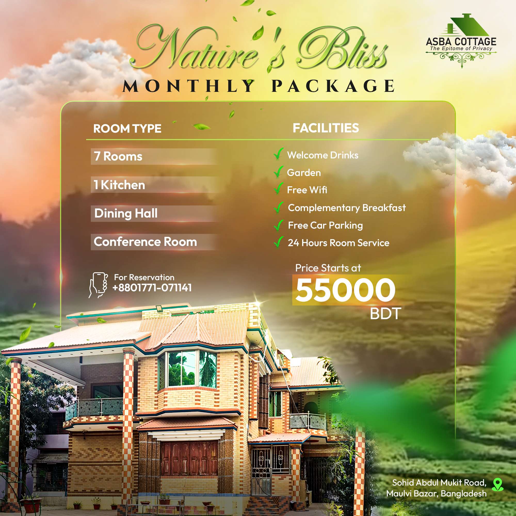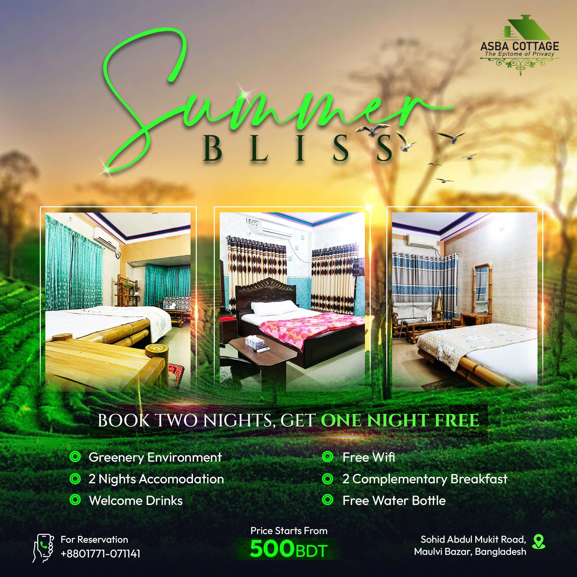 ASBA Cottage is a serene hotel in Moulvibazar near Sreemangal, offering a peaceful escape surrounded by lush tea gardens, green hills, and tropical forests. Located close to famous historical and natural attractions such as Lawachara National Park, Madhabkunda Waterfall, Baikka Beel Wetland Sanctuary, and the ancient shrine of Hazrat Shah Mustafa (R), our hotel is the perfect base for exploring the region’s rich heritage. Guests can enjoy breathtaking views of endless tea estates, misty mornings, and the soothing sounds of nature right from their cottage balcony. At ASBA Cottage, we blend eco-friendly living with modern comfort — ideal for families, couples, and travelers seeking relaxation in harmony with nature. Whether you’re bird-watching at sunrise, exploring nearby villages, or enjoying local cuisine under the stars, ASBA Cottage offers an unforgettable experience. Discover the charm of Sylhet at our tranquil hotel in Moulvibazar near Sreemangal today.