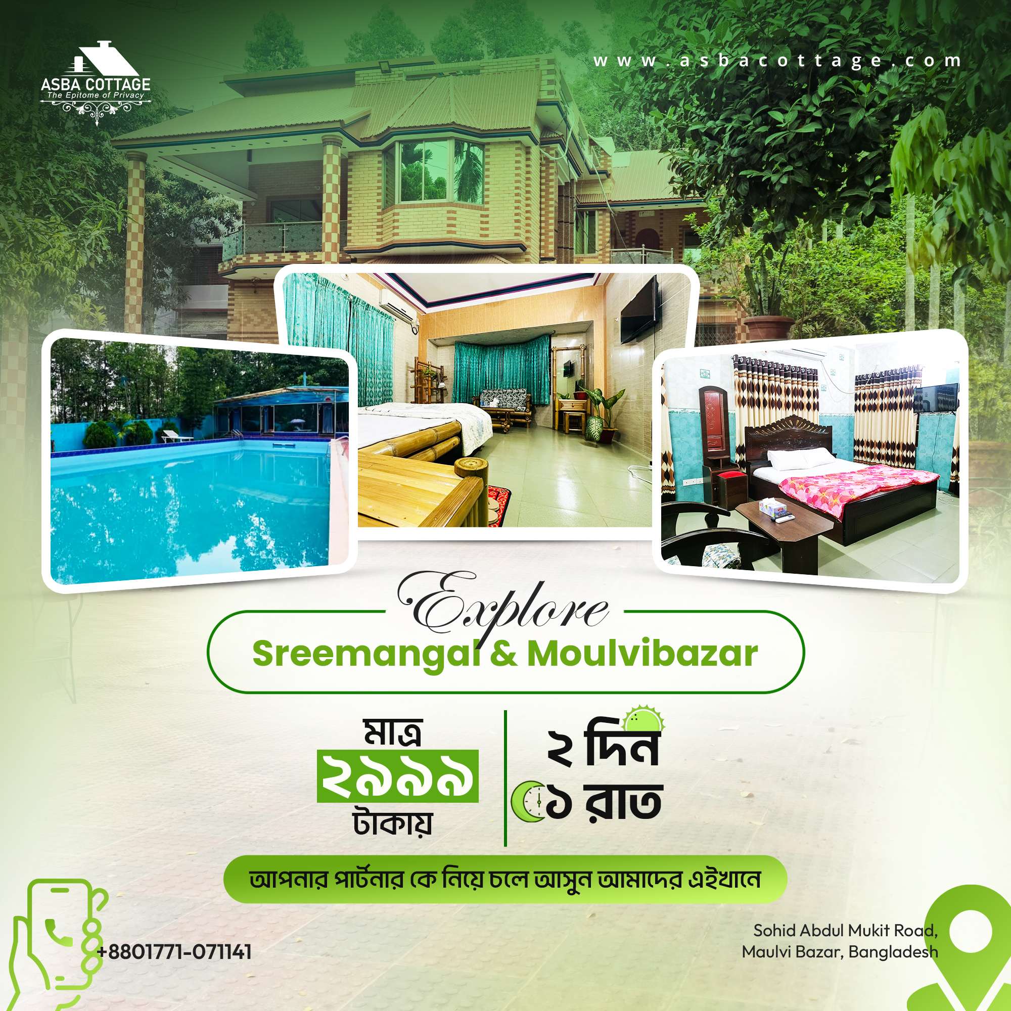 Stay at ASBA Cottage – a serene eco-friendly hotel in Moulvibazar near Srimangal. Perfect for families, couples, and nature lovers.